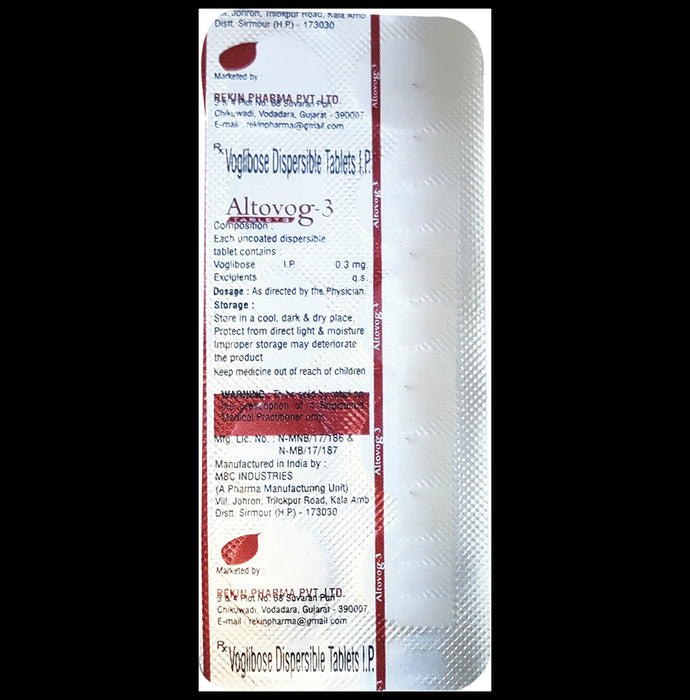 Altovog 3 Tablet DT is a medicine used to treat type 2 diabetes mellitus. It helps control the high blood sugar levels in your body after each meal. It is used when other similar medicines along with a restricted diet, are unable to control abnormally high blood sugar levels. Altovog 3 Tablet DT should be taken just before a meal. The dose and how often you need it will be decided by your doctor so that you get the right amount to control your blood sugar levels. Do not stop taking it suddenly without consulting your doctor. If you do, your blood sugar levels may increase and put you at risk of serious complications like kidney damage and blindness.This medicine is only part of a treatment program that should also include a healthy diet, regular exercise, and weight reduction as advised by your doctor. Monitor your blood sugar levels regularly while taking this medicine.The most common side effects of Altovog 3 Tablet DT include flatulence (gas), stomach pain, loss of appetite, constipation, and diarrhea. Consult your doctor if any of these side effects bother you or do not go away. This medicine by itself does not cause hypoglycemia (low blood sugar levels). However, when used in combination with other diabetes medicines (especially insulin or sulphonylureas), it can lead to hypoglycemia (low blood sugar levels). Such episodes of hypoglycemia will have to be treated by taking plain glucose. Table sugar or common sugar will not help correct low blood sugar levels if you are taking this medicine.Before taking it, let your doctor know if you have any kidney or liver problems. Do not take this medicine if you have ulceration or inflammation in the bowel (eg. ulcerative colitis or Crohn’s disease). Pregnant or breastfeeding women should also consult their doctor before taking it. Please tell your doctor about all the other medicines you are taking to make sure you are safe. Avoid excessive alcohol intake while taking this medicine as it may increase the risk of hypoglycemia (low blood sugar levels).