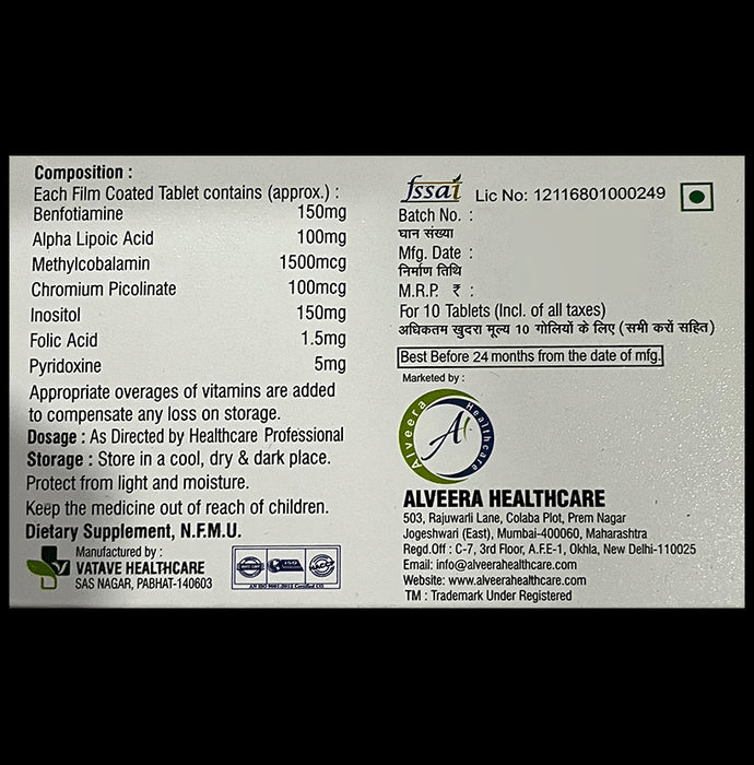 Composition : Benfotiamine,Alpha lipoic acid,Methylcobalamin,Chromium picolinate,Folic acid,Inositol,Pyridoxine