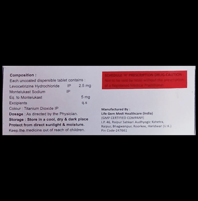 Composition : Levocetirizine (2.5mg) + Montelukast (5mg)