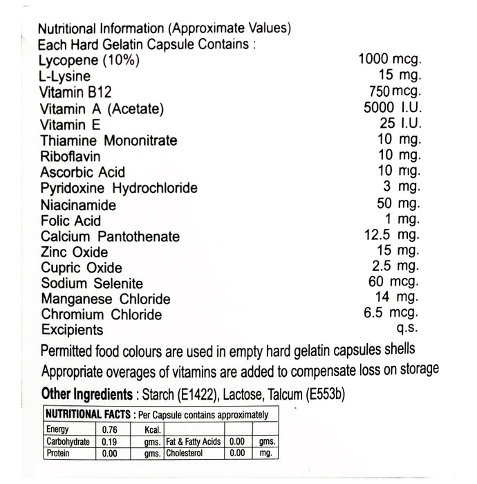 Composition : Lycopene,L-lysine,Vitamin B12,Zinc oxide,Cupric oxide