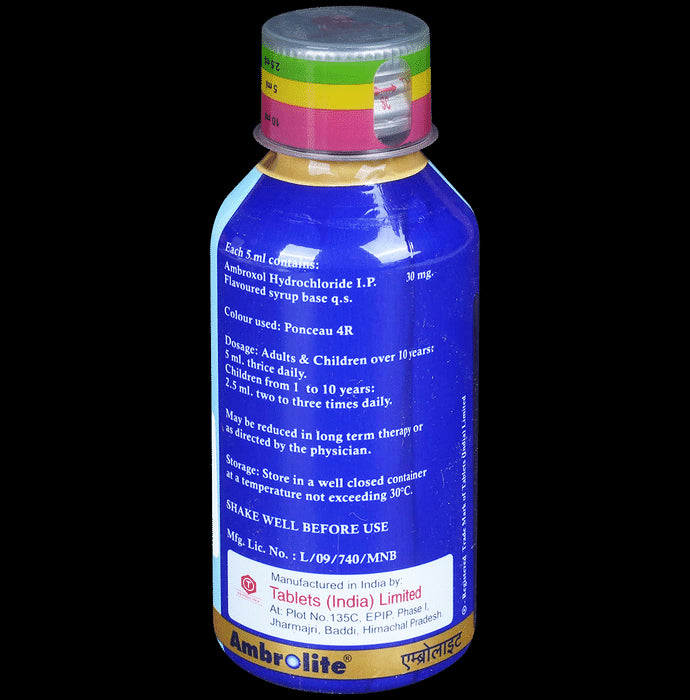 Ambrolite Syrup is used for treating various respiratory tract disorders associated with excessive mucus. It works by thinning and loosens mucus in the nose, windpipe, and lungs and make it easier to cough out. Ambrolite Syrup should be taken with food. For better results, it is suggested to take it at the same time every day. The dose and how often you take it depend on what you are taking it for. Your doctor will decide how much you need to improve your symptoms. It is advised not to use it for more than 14 days without your doctor's consultation.The most common side effects of this medicine include vomiting, nausea, and stomach upset. Talk to your doctor if you are worried about side effects or they would not go away. Generally, it is advised not to take alcohol while on treatment.Before taking this medicine, tell your doctor if you have liver or kidney disease or if you have stomach problems. Your doctor should also know about all other medicines you are taking as many of these may make this medicine less effective or change the way it works. You must take a doctor's advice before using this medicine if you are pregnant or breastfeeding.