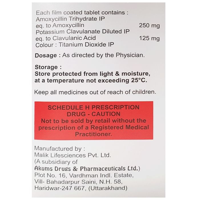 Composition : Amoxycillin (250mg) + Clavulanic Acid (125mg)