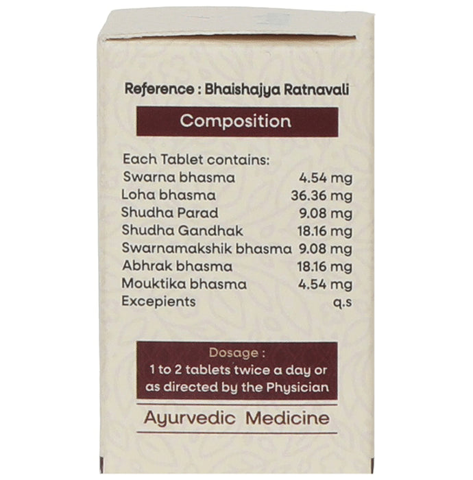 Composition : Swarna Bhasma (Calx Of Gold), Mauktika Bhasma (Calx Of Pearl), Loha Bhasma (Calx Of Iron), Abhraka Bhasma (Calx Of Mica), Shuddha Gandhaka (Purified Sulphur), Shuddha Parad (Purified Mercury), Swarnamakshika Bhasma (Calx Of Iron Pyrites), Kantakari Extracts, Adraka (Ginger Extracts), Dugdha (Milk) And Yashtimadhu