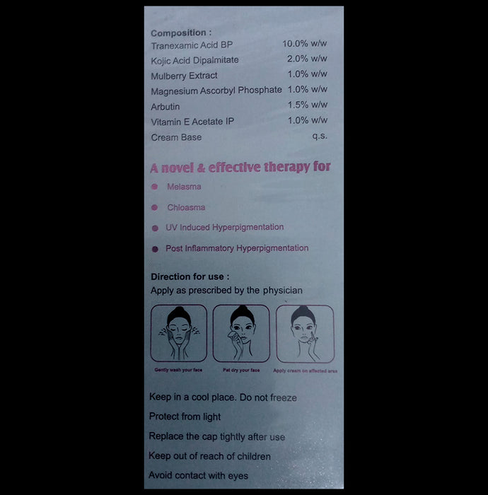 Composition : Tranexamic Acid (10% w/w) + Kojic Acid (2% w/w) + Arbutin (1.5% w/w) + Magnesium (1% w/w) + Vitamin E (1% w/w) + Mulberry extract (1% w/w)