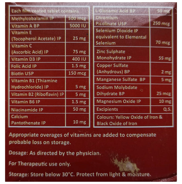 Composition : Methylcobalamin IP, Vitamin A BP 5000 IU, Vitamin E (Tocopheryl Acetate) IP 25 mg, Vitamin C (Ascorbic Acid) IP 75 mg, Vitamin D3 IP 400 IU, Folic Acid IP 1.5 mg, Biotin USP 150 mcg, Vitamin B1 (Thiamine Hydrochloride) IP 5 mg, Vitamin B2 (Riboflavin) IP 5 mg, Vitamin B6 IP, Niacinamide IP, Calcium Pantothenate IP 10 mg, L-Glutamic Acid BP, Chromium Picolinate USP 250 mcg, Selenium Dioxide IP equivalent to Elemental Selenium 70 mcg, Zinc Sulphate Monohydrate IP 55 mg, Copper Sulfate (Anhydrous) BP 2 mg, Manganese Sulfate BP 5 mg, Sodium Molybdate Dihydrate BP 25 mcg, Magnesium Oxide IP 10 mg, Excipients QS., Colours: Yellow Oxide of Iron & Black Oxide of Iron