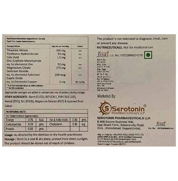 Composition : Thiamine Nitrate,Pyridoxine Hydrochloride,Folic Acid,Zinc Sulphate Monohydrate eq. to elemental Zinc,Magnesium Citrate,Selenium Dioxide eq. to elemental Selenium,Cupric Oxide eq, to Flemental Copper