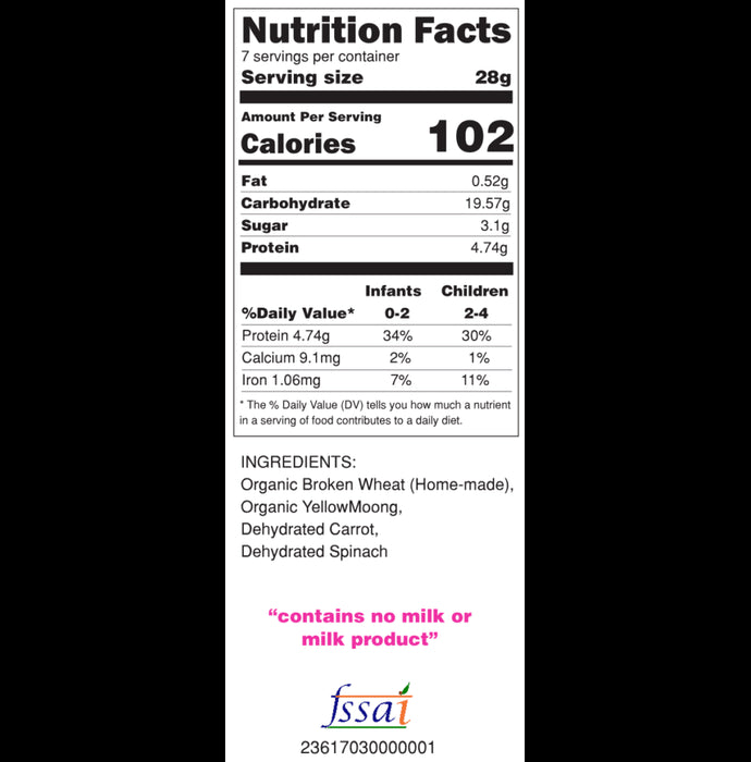 Composition : Organic broken wheat,Organic yellow moong,Dehydrated carrot,Dehydrated spinach