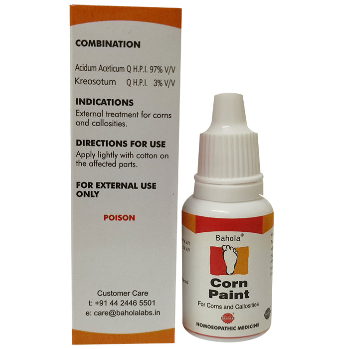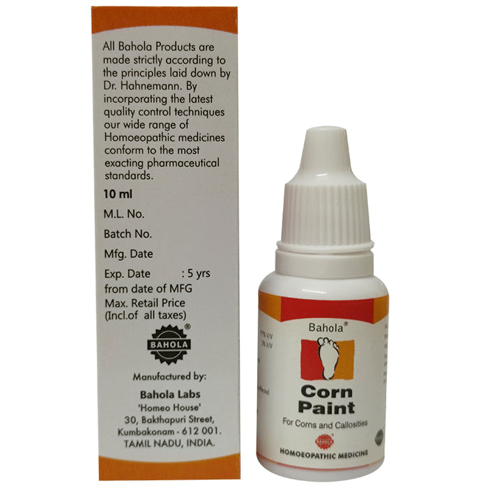 Bahola Corn Paint is recommended in all types of warts, corns and also beneficial in treating benign epithelial tumors, hyperkeratosis. It is a safe, effective and a painless medication to effectively deal with warts and corns. It is easy to administer and most importantly, it does not leave any marks or scars on the skin.