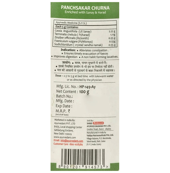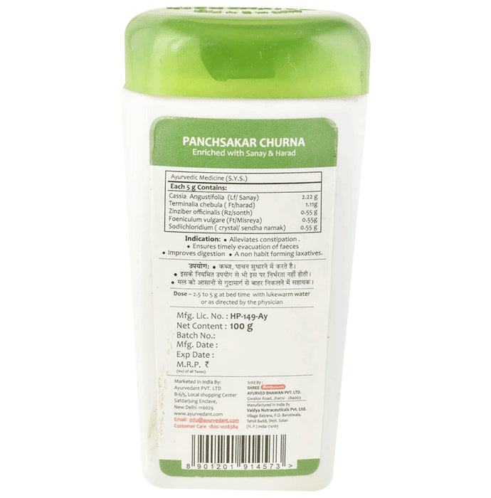 Baidyanath Ayurvedant Panchsakar Churna can alleviate constipation and related concerns such as indigestion, colic (abdominal pain). It is a mixture of five potent ingredients - haritaki (Terminalia chebula), svarna patri (Cassia angustifolia), sunthi (Zingiber officinalis) and rock salt that are all responsible for managing digestive disorders.