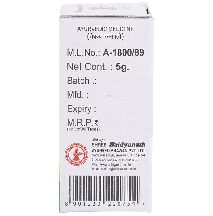 Composition : Shuddha parada,Shuddha gandhaka,Abhraka bhasma,Loha bhasma,Tamra bhasma,Varatika bhasma,Juice extract of Nagavalli
