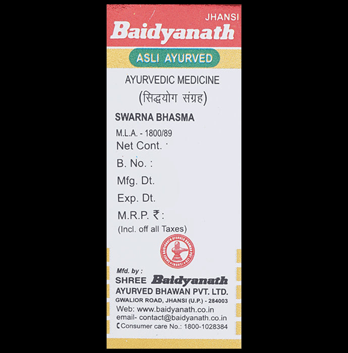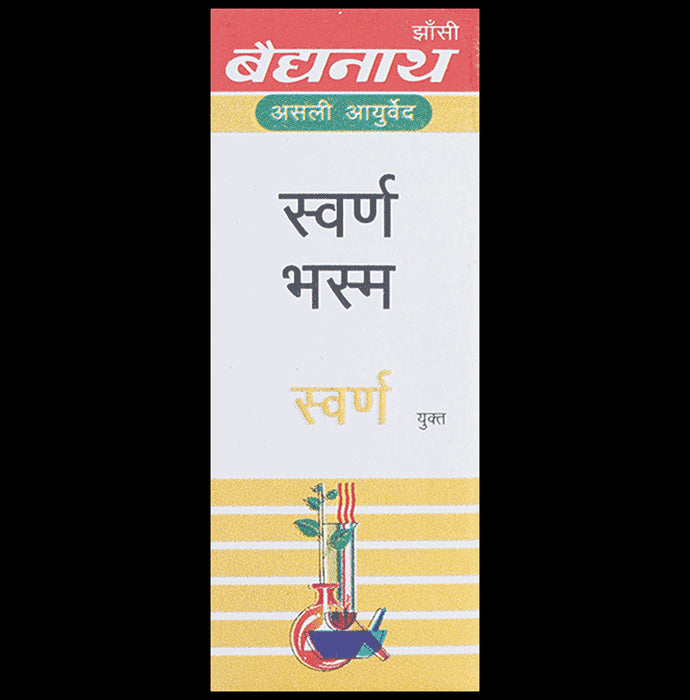 Baidyanath (Jhansi) Swarna Bhasma with GoldSwarna Bhasma is an Ayurvedic aphrodisiac that helps to improve stamina, strength, and low sperm count. It is also useful in tuberculosis, anaemia and asthma. Ayurveda is a 5000-year-old science of health care and herbal treatment. Ayurveda is highly effective in common and complicated ailments, assures long term relief and has no side effects. It is now backed by modern scientific research and technologies and provides its gentle healing touch to millions around the world.