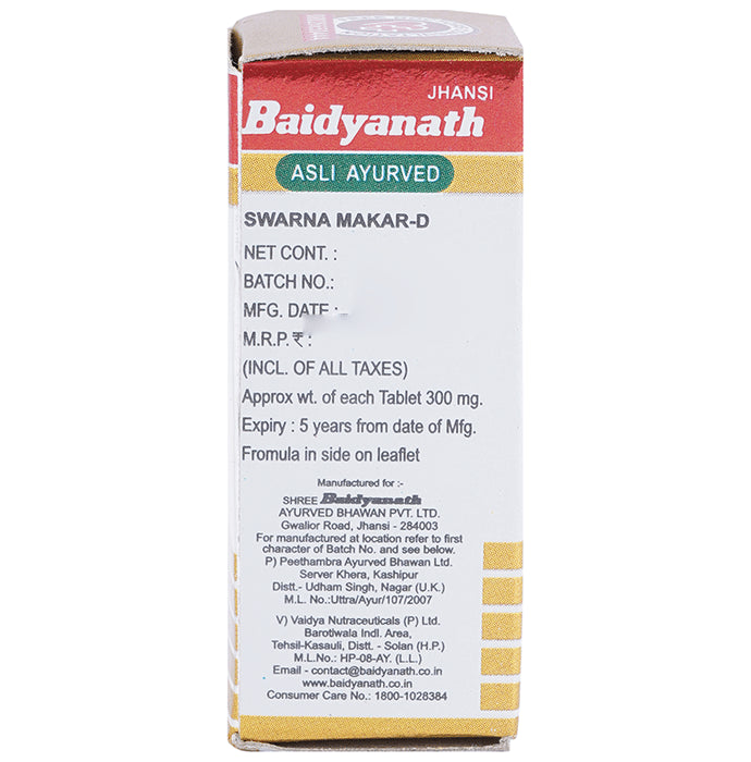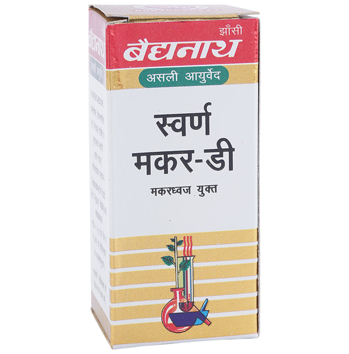 Baidyanath (Jhansi) Swarna Makar-D Makardhwaja Yukta is a unique combination of safe medicinal herbs and minerals. It acts as an aphrodisiac, rejuvenator and a nerve tonic. It also helps in maintaining vigour and vitality by improving energy levels, strength and stamina. Moreover, it helps in maintaining general health and well-being.