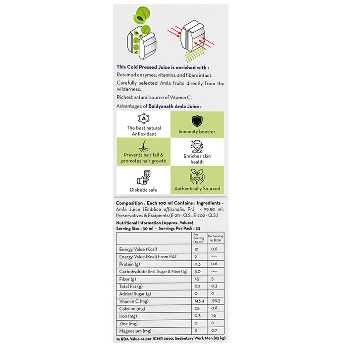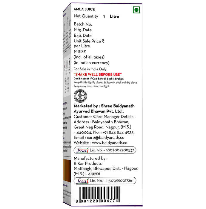 Baidyanath (Nagpur) Amla Juice has been extracted from fresh Indian Gooseberry or Amla to provide multiple health benefits for a healthy body and mind. Amla juice is enriched with vitamin C, iron, phosphorus, folic acid, carbohydrates, and calcium, which can help strengthen immunity and detoxify.
