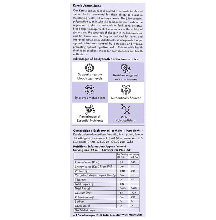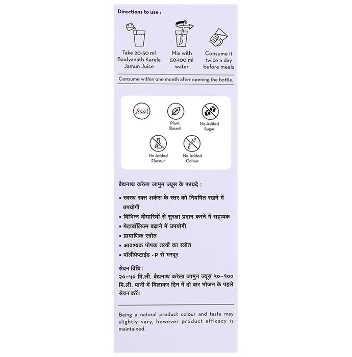 Baidyanath (Nagpur) Karela Jamun Juice (1Litre Each) helps in maintaining the body functions normally. Baidyanath Karela Jamun Juice is 100% pure, natural and free from any synthetic flavour and colour. It contains several vitamins and minerals that the body needs for its well-being. Also helps in detoxifying the blood.