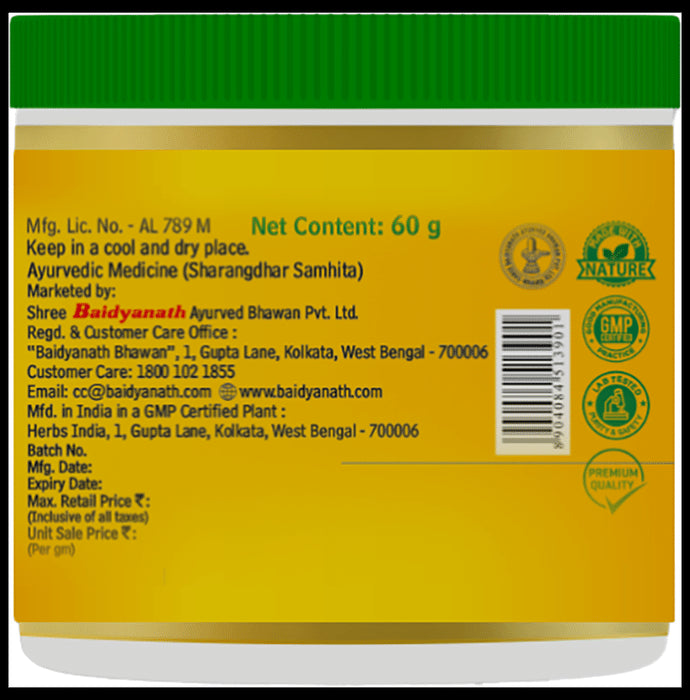 Baidyanath Talisadi Churna contains Talishpatra, Trikatu, Banshlochan, Ela, and Dalchini. Talishpatra has anti-inflammatory properties and helps in treating respiratory diseases. Trikatu is a combination of dry ginger and long pepper and helps improve digestive functions in the body and burns off toxins or metabolic wastes. Elaychi helps in promoting digestion and preventing bloating. Baidyanath Talisadi Churna has digestive and tonic properties and can especially treat respiratory issues in the body.Direction for use:A person must consume 1 to 4g of churna twice a day before meals. It can be consumed with 4 to 6g honey or warm water. Sugar is used in this medicine as a cooling agent to make it easier to use. Use under medical supervision.