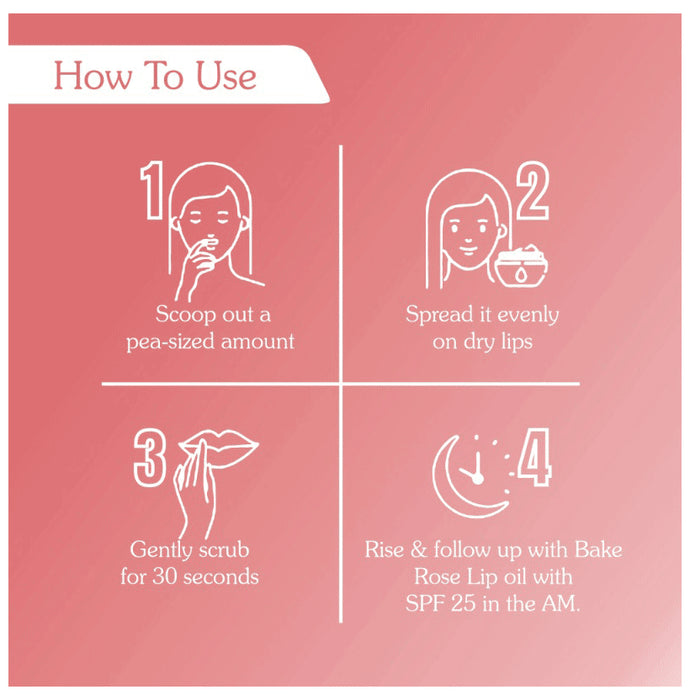 Scoop a small amount of BAKE Vitamin C Rose Lip Scrub with the back of your finger and scrub for about 20-30 seconds