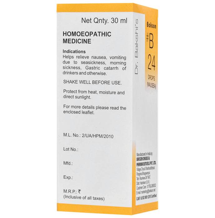 Bakson's Bakson B24 Nausea DropBakson B24 Nausea Drop helps deal with drowsiness to relieve chronic nausea, vomiting, and vertigo. It reduces anxiety and motion sickness while travelling or during pregnancy. It aids in the relief of gastrointestinal disorders as well as the reduction of abdominal pain.