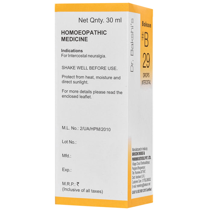 Bakson’s B29 Intercostal Drops is an effective remedy for the treatment of Intercostal neuralgia. It is an extremely painful disorder that causes damage to the nerves and renders them dysfunctional. Its symptoms include sharp pain in the chest beginning from the back. It can be an extremely distressing situation and Intercostal Drops provides effective relief from it.