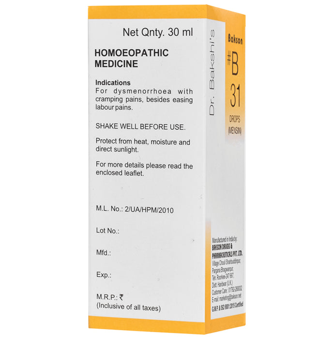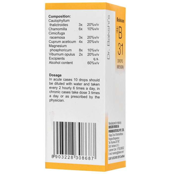 Bakson's B31 Mensin Drop is a homeopathic formulation available in the form of drops. The drops are enriched with natural herbs and herbal tinctures that helps in the management and treatment of painful menses.
