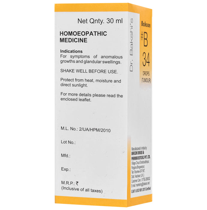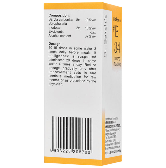 Bakson’s B34 Tumor Drops Bakson B34 drops are a potent homoeopathic remedy for growths and uterine fibroids. This particular homoeopathic medicine has a remarkable affinity for glandular structures and can help diminish the size of growths.The active components of Bakson B34 drops, namely Scrophularia nodosa and Baryta carbonica, collaborate to alleviate the symptoms of growths such as fibroids. Scrophularia nodosa is a potent homoeopathic medicine for uterine fibroids that can aid in the dissolution of breast nodules and reduce the size of uterine fibroids. Baryta carbonica is useful in relieving indurations in the breasts.If you seek a natural and efficient homoeopathic medicine to relieve growths and indurations, Bakson B34 homoeopathic drops are an ideal choice. However, it is always prudent to consult a medical professional before trying any new medication or supplement.