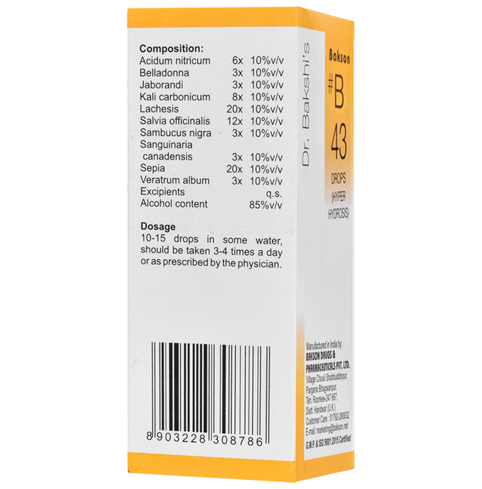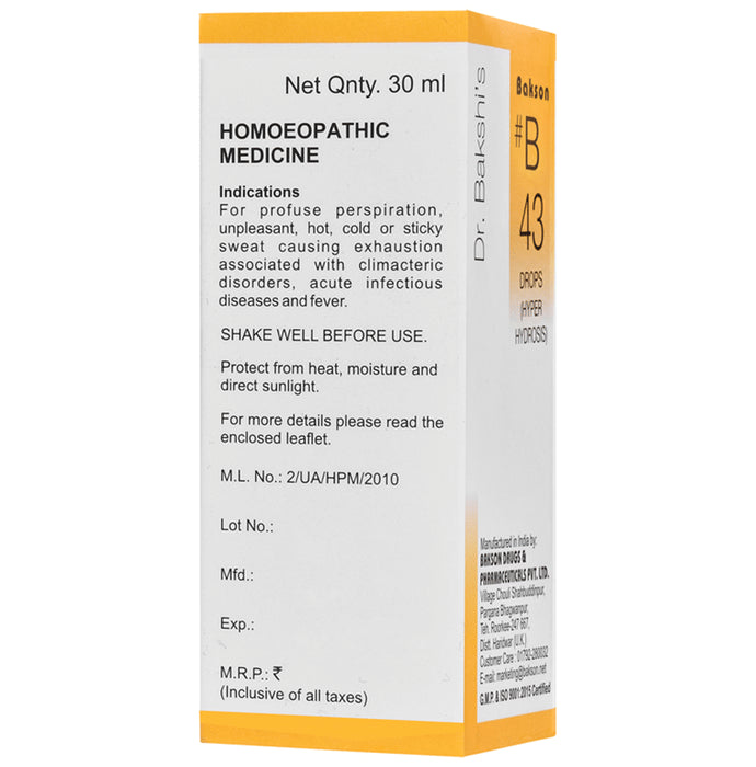 Bakson’s B43 Hyper Hydrosis Drops is a homoeopathic remedy for the treatment of Hyper Hydrosis. It is a condition that causes profuse sweating above the normal levels required for Thermo Regulation. General symptoms of Hyper Hydrosis include sweaty palms, soles and axillae. There are several reasons for Hyper Hydrosis such as stress either physical or emotional. Hydrosis drops help in controlling excess perspiration and bad odour.
