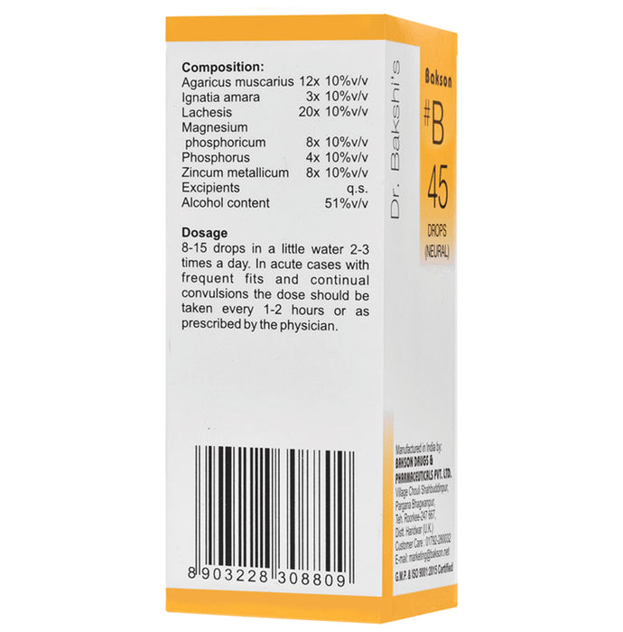 Bakson's B45 Neural Drops is primarily used for the treatment of Nervous Irritability in the body such as Twitching, convulsions and improper sleep. The body’s nervous system consists of various nerves and it is responsible for coordination and control of various part of the body. Regular use of neural drops helps in reducing problems related to the nervous system