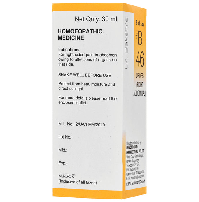 Bakson’s B46 Right Abdominal Drops helps relieve abdominal pain. Abdominal pain is caused due to various reasons and dependent upon the affected organ, the pain could be either on the left or right side of the organ. Right abdominal pain has no known cause and it is accompanied by other symptoms. Abdominal drop is specially formulated to treat pain in the right side of the abdomen and treats other symptoms associated with it.