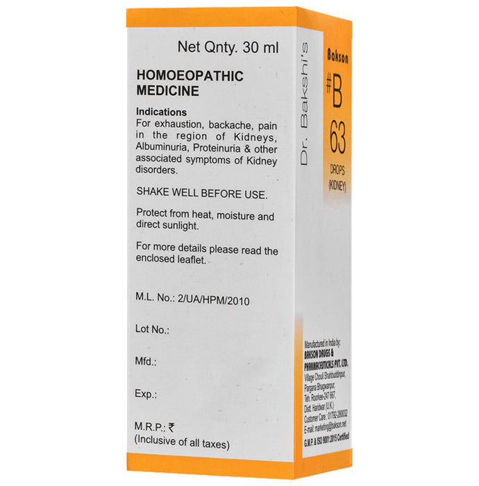 Bakson’s B63 Kidney Drops Bakson B 63 drops is a potent homoeopathic medicine for kidney-related symptoms. It is formulated to alleviate exhaustion, lower back pain, and discomfort in the kidney region, while also addressing conditions such as albuminuria, proteinuria, and other associated symptoms of kidney disorders.This natural remedy is effective in improving kidney function and promoting overall kidney health. It is also beneficial for individuals experiencing a burning sensation in the kidney region or reduced urine output.As a homoeopathic medicine for kidney issues, Bakson B 63 drops are safe to use and do not have any harmful side effects. However, it is always recommended to consult with a doctor before trying any new medication or supplement.If you are looking for a natural and effective way to address your kidney-related symptoms, Bakson B 63 drops could be an ideal option for you.