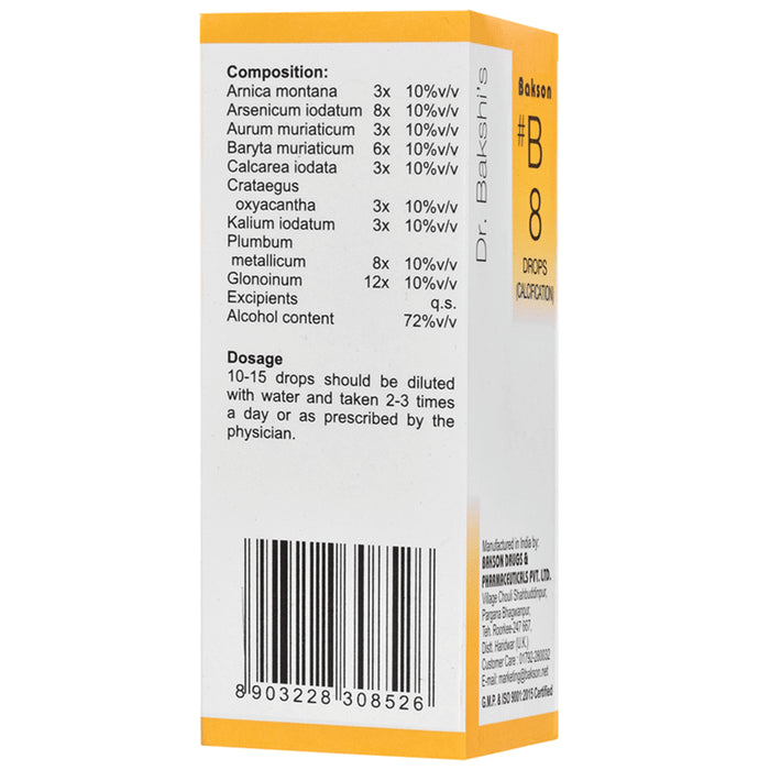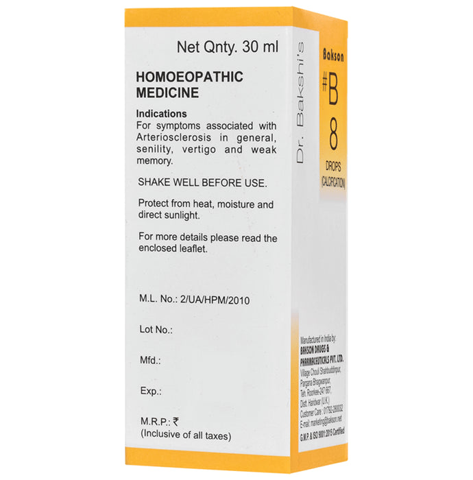 Bakson B8 Calcification Drop This homoeopathic medicine for cleaning arteries is specially formulated to reduce the thickening and hardening of artery walls, which can help improve heart function and overall health.Calcification can be a serious condition that disrupts the body’s normal processes. But with Bakson’s B8 Calcification Drops, you can help support your body’s natural healing processes and reduce the risk of complications. Whether you’re dealing with calcification in your blood vessels or a particular organ, this powerful formula can help.One of the biggest benefits of Bakson’s B8 Calcification Drops is that it’s made from all-natural ingredients. This means you don’t have to worry about any harmful side effects or negative interactions with other medications you may be taking. Plus, it’s easy to use – simply add a few drops to your water or juice and drink it down.Bakson’s B8 Calcification Drops is also the best homoeopathic medicine for vertigo. If you suffer from this common condition, you know how debilitating it can be. But with regular use of Bakson’s B8 Calcification Drops, you can help reduce the frequency and severity of vertigo episodes, so you can get back to your normal routine. The natural ingredients in this formula have been shown to help enhance cognitive function and memory recall, so you can stay sharp and focused all day long.