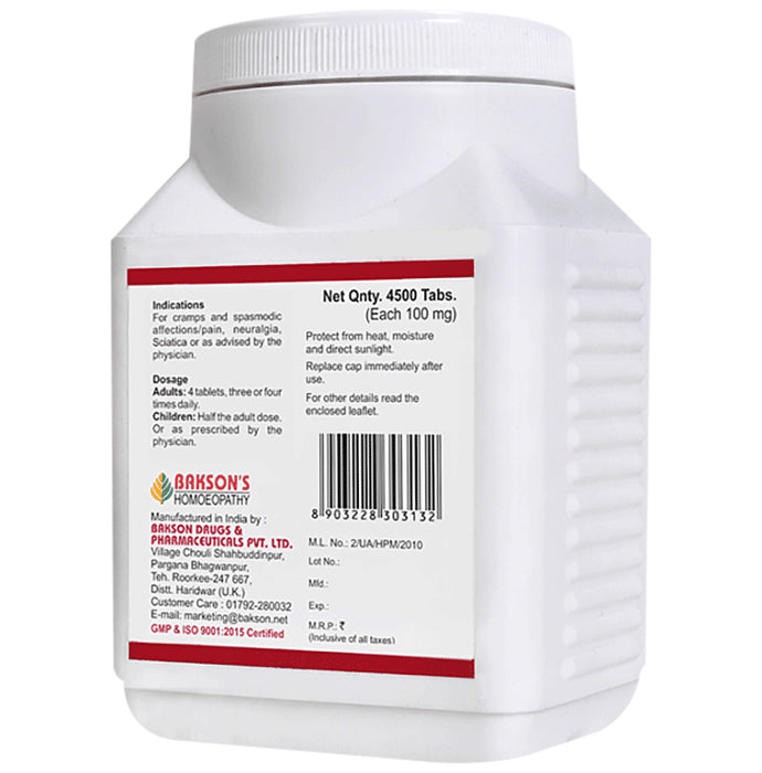 Bakson's Magnesium Phosphoricum Biochemic Tablet helps to create the white fibres of the muscles and nerves. It is used for spasms, pains, Neuralgia, sharp pain, cramps, Angina Pectoris, Chorea, St. Vitus's dance, Epilepsy, colic, toothache, labour pains, menstrual colic, colic, Ovarian neuralgia, spasmodic conditions, cardiac-related problems. Attacks are often attended with great prostration, sometimes with profuse sweat.