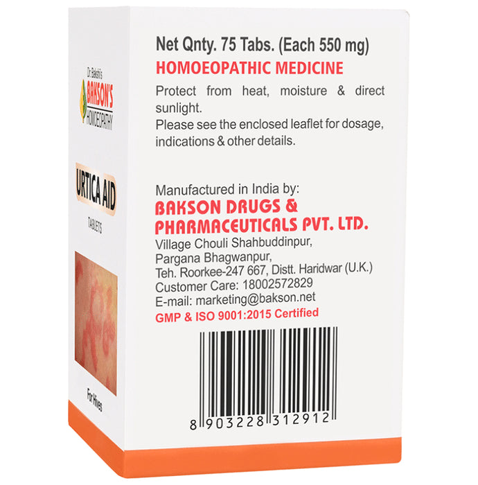 Bakson's Urtica Aid Tablet helps relieve intolerable itching, stinging pains of hives/urticaria and symptoms of Angioedema besides fighting ill effects of suppressed Urticaria.