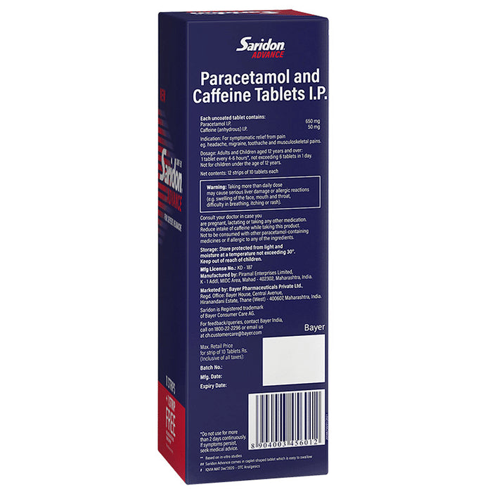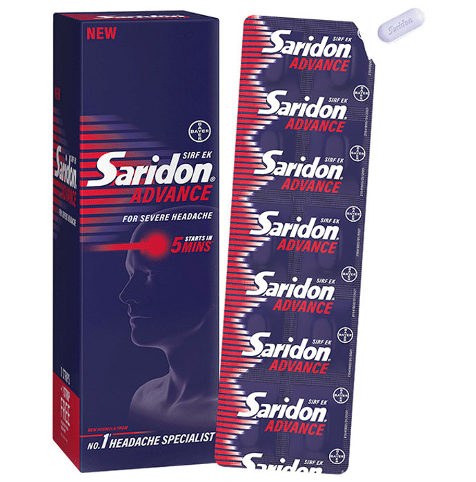 Saridon Advance Tablet (Bayer Pharmaceuticals Pvt Ltd)Saridon Advance Tablet is a new advanced formula of the India’s leading headache specialist. It starts action within 5 minutes to offer relief from severe headaches, migraine pain, toothache and body aches.