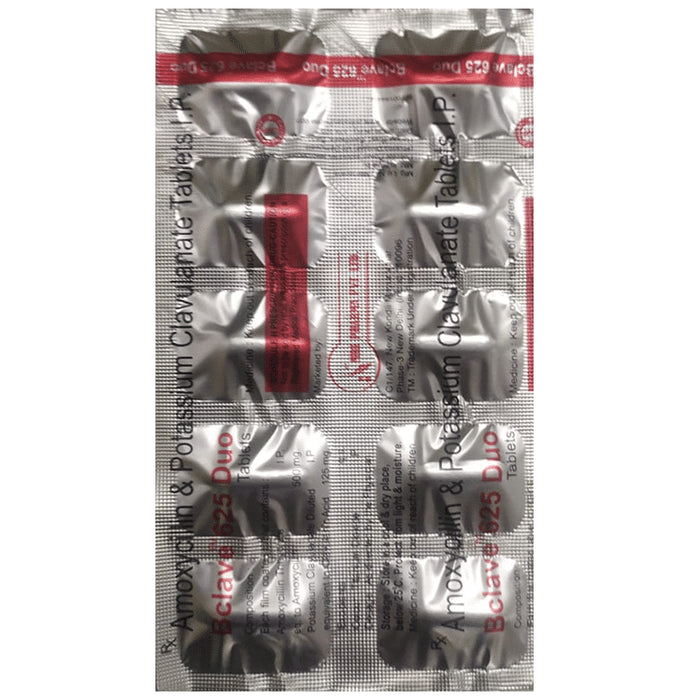 Bclave 625 Duo Tablet is an antibiotic that helps your body fight infections caused by bacteria. It is used to treat infections of the lungs (e.g., pneumonia), ear, nasal sinus, urinary tract, skin, and soft tissue. It will not work for viral infections such as the common cold. Bclave 625 Duo Tablet is best taken with a meal to reduce the chance of a stomach upset. You should take it regularly at evenly spaced intervals as per the schedule prescribed by your doctor. Taking it at the same time daily will help you remember to take it. The dose will depend on what you are being treated for, but you should always complete an entire course of this antibiotic as your doctor prescribes. Please do not stop taking it until you have finished, even when you feel better. If you stop taking it early, some bacteria may survive, and the infection may return or worsen.The most common side effects of Bclave 625 Duo Tablet include nausea, diarrhea, vomiting, fungal infections of the mouth, skin fold or vagina, skin rashes, and vaginitis. These are usually mild, but let your doctor know if they bother you or will not go away.Before taking it, let your doctor know if you are allergic to any antibiotics or have kidney or liver problems. You should also inform your healthcare team about all other medicines you are taking as they may affect or be affected by Bclave 625 Duo Tablet. This medicine is generally considered safe to use during pregnancy and breastfeeding if prescribed by a doctor.