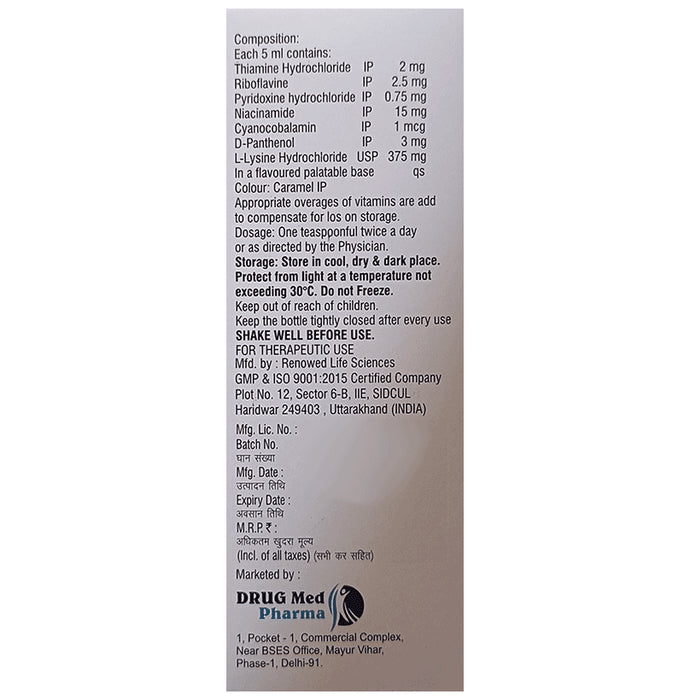 Composition : Thiamine hydrochloride, Riboflavin, Niacinamide, D-Panthenol, Cyanocobalamin, Pyridoxine hydrochloride, L-lysine hydrochloride