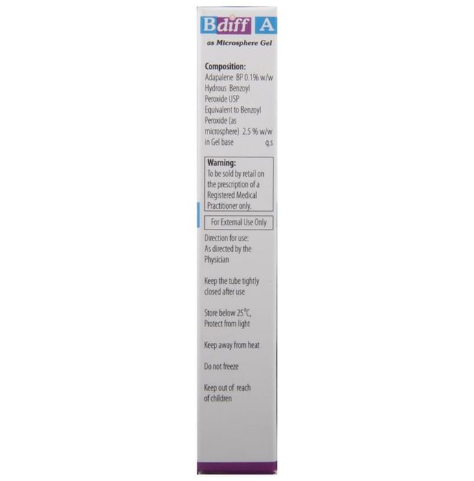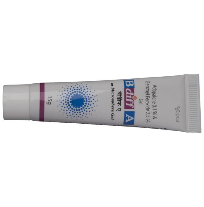 Bdiff A Gel is a combination of two medicines: Adapalene and Benzoyl Peroxide, which treats acne (pimples). Adapalene is a form of vitamin A and Benzoyl Peroxide is a keratolytic medicine. Together, they prevent accumulation of the sebum (skin’s natural oil), unblock the pores and allow natural exfoliation of the outer layers of skin. Benzoyl Peroxide additionally penetrates into the skin and kills acne-causing bacteria.