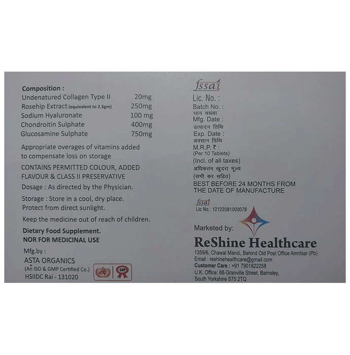 Composition : UnDenatured Type II Collagen 20mg, Rosehip Extract 250mg, Sodium Hyaluronate 100mg, Chondroitin Sulphate 400mg, Glucosamine Sulphate 750mg