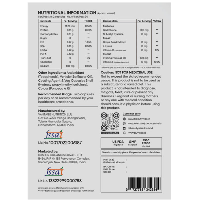 Composition : Glutathione,N-Acetyl Cysteine,Grape Seed Extract,L-Lysine,Vitamin C (L-Ascorbic Acid),Evening Primrose Oil,Vitamin E,Other Ingredients: Antioxidant (Tocopherols), Vehicle (Safflower Oil), Coating Agent and Veg Capsules Shell (Hydroxy propyl methyl cellulose)