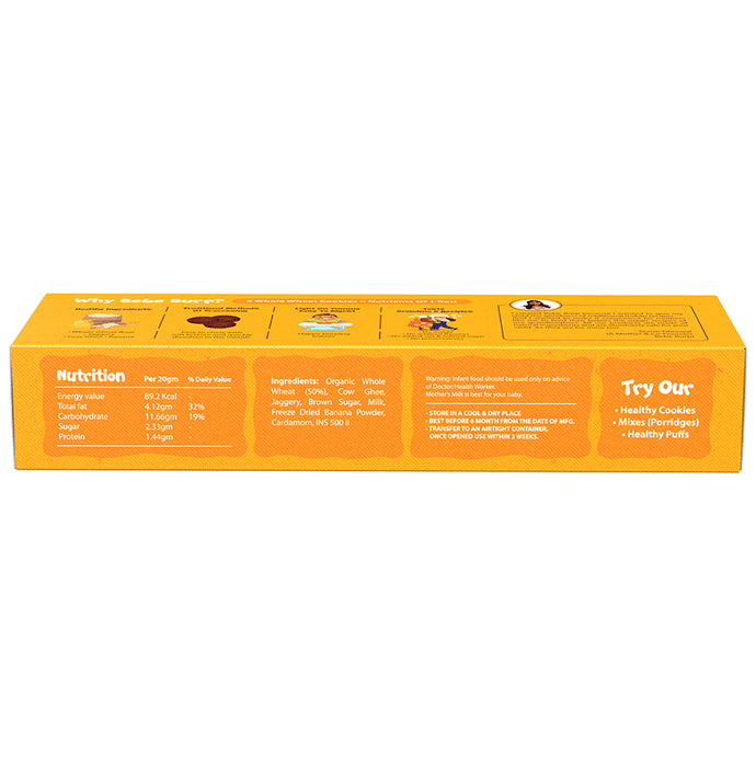 Bebe Burp 8M+ Whole Wheat & Banana CookieThis junk-free snack is mindfully made to nourish you and your baby so that you can enjoy it without feeling guilty. Wheat cookies help provide this good energy source in your little one's diet. It is rich in nutrients and fibre, these biscuits are ideal as mid-morning or 5 pm snacks for your kids.