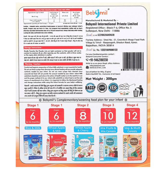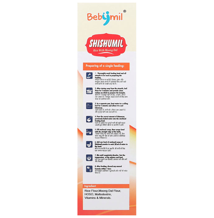 Bebymil Shishumil Rice with Moong Dal 6M+ is a food supplement for infants over six months. It is 100% pure and hygienic with no added sugar and salt. It contains iron and folic acid, and 17 vitamins and minerals.