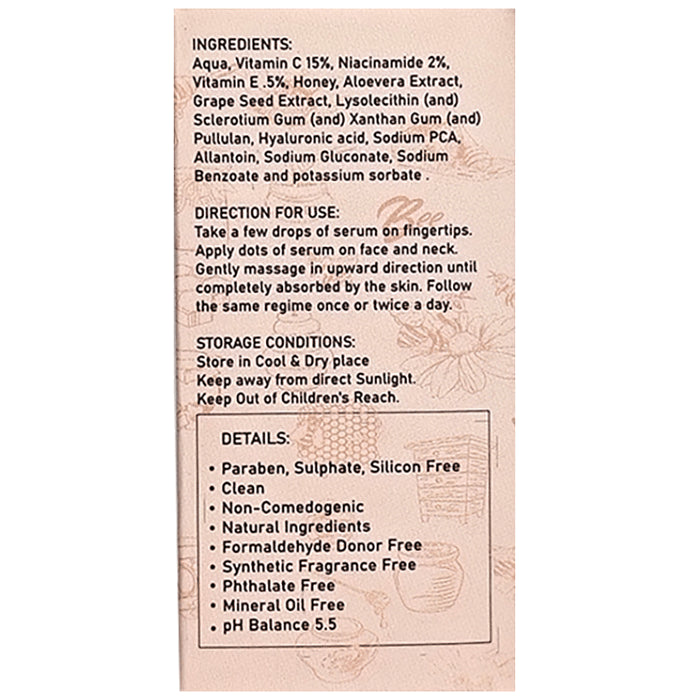 Composition : Aqua, Vitamin C 15%, Niacinamide 2%, Vitamin E 0.5%, Honey, Aloe Vera Extract, Grape Seed Extract, Lysolecithin (and) Sclerotium Gum (and) Xanthan Gum (and) Pullulan, Hyaluronic Acid, Sodium PCA, Allantoin, Sodium Gluconate, Sodium Benzoate, and Potassium Sorbate