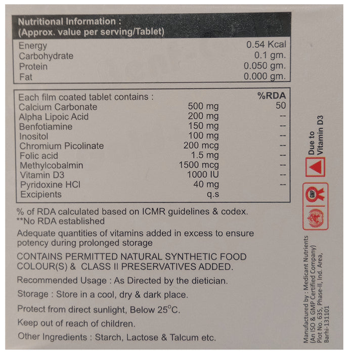 Composition : Calcium Carbonate, Alpha Lipoic Acid, Benfotiamine, Inositol, Chromium Picolinate, Folic acid, Methylcobalamin, Vitamin D3, Pyridoxine HCI, Excipients
