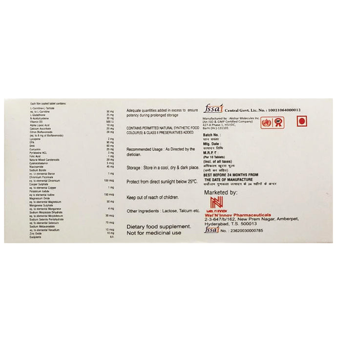 Composition : Lycopene, EPA, curcumin, pyridoxine HCL, folic acid, natural mixed carotenoids, niacinamide, copper, magnesium oxide, zinc oxide, omega 3 fatty acids, essential amino acids, vitamins minerals and trace elements