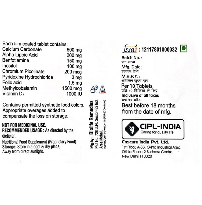 Composition : Calcium carbonate,Alpha lipoic acid,Hydrochloride,Folic acid,Vitamin D
