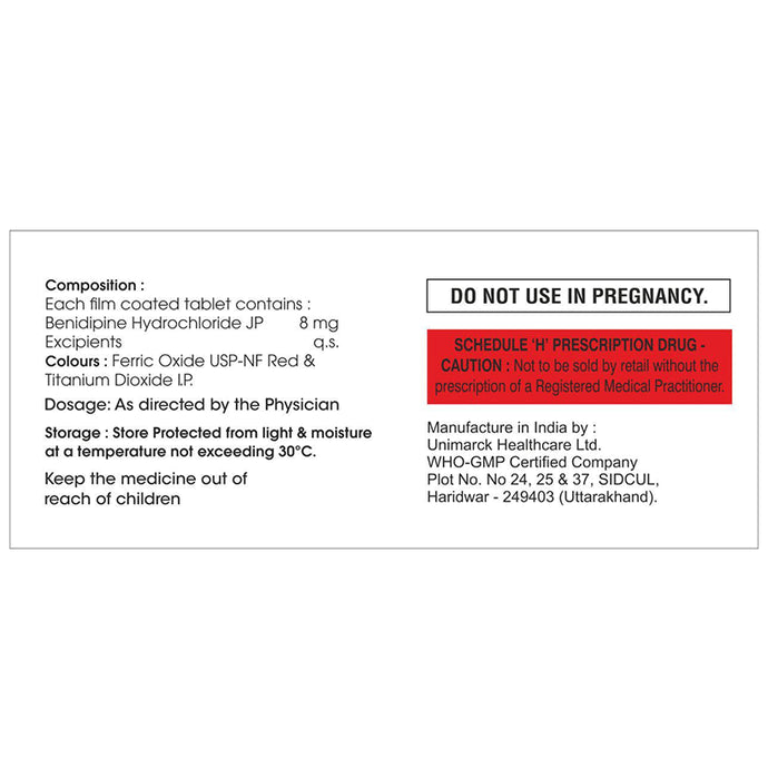 Benisky 8 Tablet belongs to a class of medicines known as calcium channel blockers. It is used to treat high blood pressure (hypertension) and prevent angina (heart-related chest pain). It lowers blood pressure and reduces the heart's workload, which helps prevent heart attacks and strokes. Benisky 8 Tablet may be prescribed alone or along with other medicines. The dose depends on what you are taking it for and the severity of your condition. You can take it at any time of the day, but it is best to take it at the same time each day. It should be taken with food. Keep taking it for as long as advised by your doctor. Do not stop this medicine on your own, even if you feel well, as high blood pressure often has no symptoms. If you stop taking it, your condition may get worse. Keeping active with regular exercise, reducing your weight, and eating a healthy diet will also help control your blood pressure.The most common side effects include fatigue, edema (swelling in the feet or ankles), sleepiness, dizziness, flushing, rashes, headache, and unusual beating of the heart (palpitations). Consult your doctor if any of these bother you, or do not go away.Before taking it, let your doctor know if you have any liver or kidney problems. Pregnant or breastfeeding women should also consult their doctor for advice before taking this medicine. You also need to tell your doctor what other medicines you are taking, especially those used to treat high blood pressure or heart conditions. You should have your blood pressure checked regularly to make sure that this medicine is working properly.