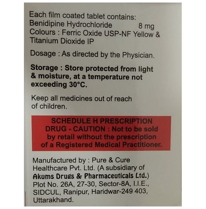 Benitowa 8 Tablet belongs to a class of medicines known as calcium channel blockers. It is used to treat high blood pressure (hypertension) and prevent angina (heart-related chest pain). It lowers blood pressure and reduces the heart's workload, which helps prevent heart attacks and strokes. Benitowa 8 Tablet may be prescribed alone or along with other medicines. The dose depends on what you are taking it for and the severity of your condition. You can take it at any time of the day, but it is best to take it at the same time each day. It should be taken with food. Keep taking it for as long as advised by your doctor. Do not stop this medicine on your own, even if you feel well, as high blood pressure often has no symptoms. If you stop taking it, your condition may get worse. Keeping active with regular exercise, reducing your weight, and eating a healthy diet will also help control your blood pressure.The most common side effects include fatigue, edema (swelling in the feet or ankles), sleepiness, dizziness, flushing, rashes, headache, and unusual beating of the heart (palpitations). Consult your doctor if any of these bother you, or do not go away.Before taking it, let your doctor know if you have any liver or kidney problems. Pregnant or breastfeeding women should also consult their doctor for advice before taking this medicine. You also need to tell your doctor what other medicines you are taking, especially those used to treat high blood pressure or heart conditions. You should have your blood pressure checked regularly to make sure that this medicine is working properly.