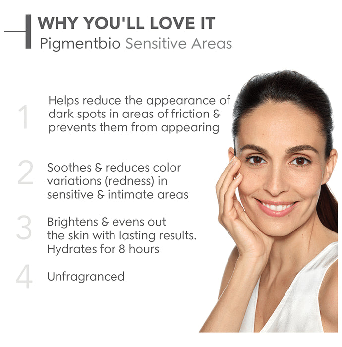Bioderma Pigmentbio Sensitive Areas Cream is a care product designed to effectively address uneven skin in delicate and intimate areas. This product contains a patented combination of active ingredients recognised for their depigmenting action: andrographolide, lysine azelate and glabridin. These active ingredients can regulate the biological mechanisms that cause uneven skin for optimum brightening and preventive efficacy. Pigmentbio sensitive areas thus may help brighten and even out areas of friction (knees, elbows, neck, underarms, thighs, and groin) and external intimate areas. In addition to this patented combination of active ingredients, this product contains a golden seaweed extract (laminaria ochroleuca) that may help soothe irritated, sensitive areas and prevent redness, which can also cause skin colour variations.