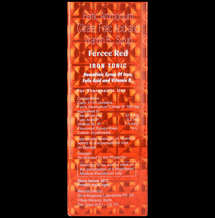 Fercee Red Syrup is a nutritional supplement primarily used for the treatment of iron deficiency anaemia and nutritional deficiencies. It contains ferrous ammonium citrate, which is a source of iron. Iron plays a crucial role in transporting oxygen throughout the body and maintaining red blood cells