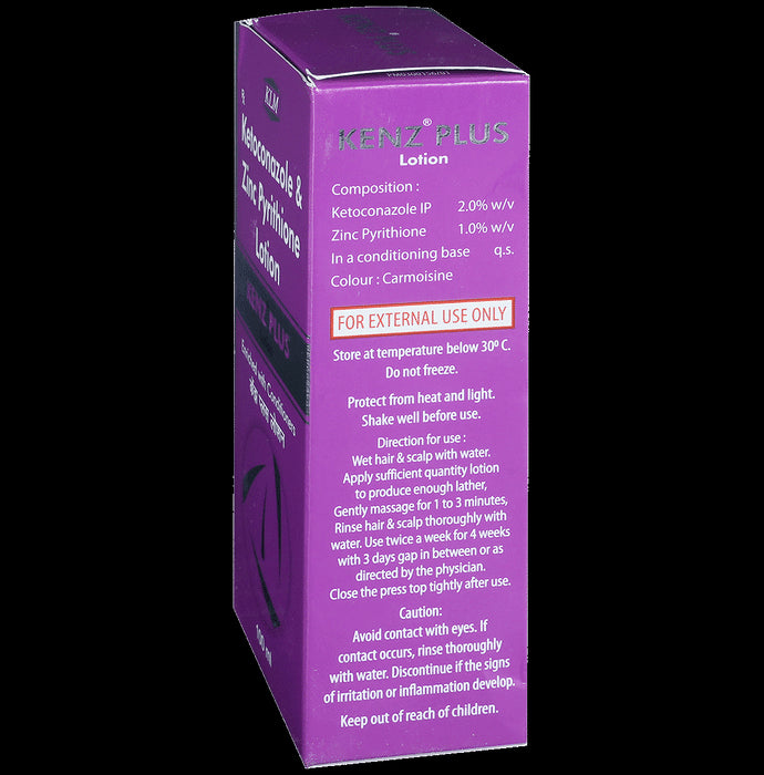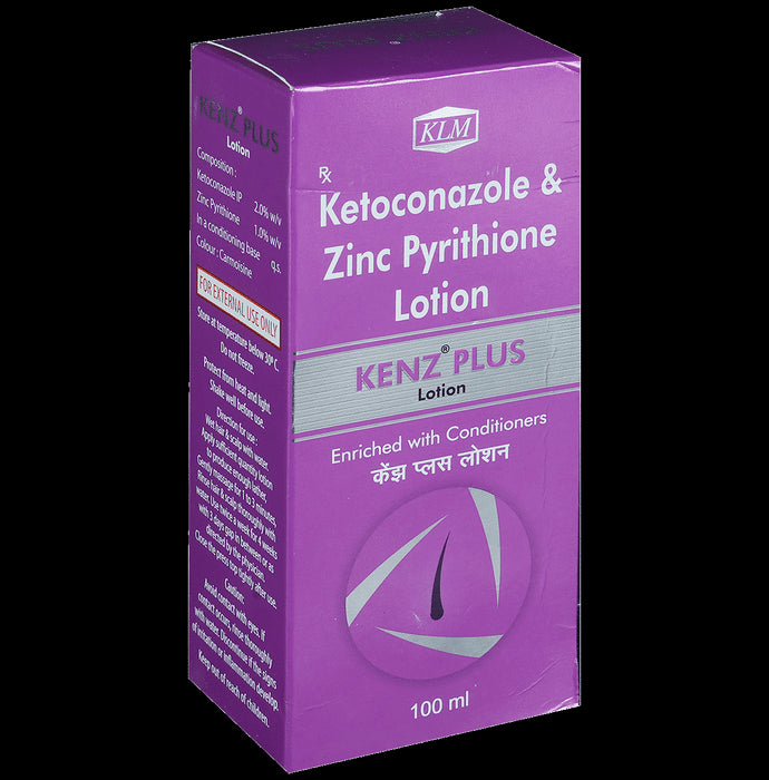 Kenz Plus Lotion is a combination of two antifungal medicines: Ketoconazole and Zinc pyrithione. It works by destroying the cell membrane of fungi that cause dandruff.