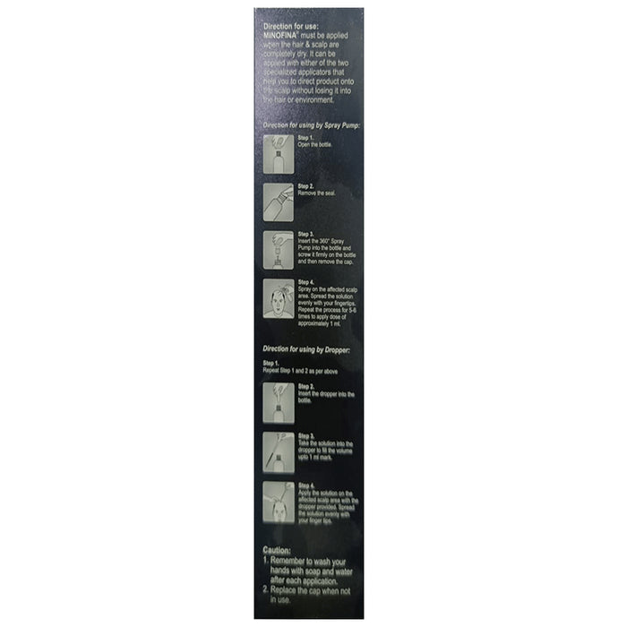 Minofina Solution is a combination medicine used in the treatment of hair loss in men. It works by increasing blood flow to the hair follicles which further prevents hair loss and stimulates re-growth resulting in longer, thicker and increased numbers of hair. Use Minofina Solution in the dose and duration as prescribed by your doctor or as instructed in the label. Clean and dry your scalp before using it. It may take several months before you notice any hair growth. The first growth could be soft, colorless, and barely visible. Use it in the exact dose and duration as prescribed by your doctor. Using more than recommended will not speed up hair growth and may increase the likelihood of side effects. Use it for as long as the doctor has prescribed to maintain proper hair growth. If your condition does not improve after using it for 4 to 6 months, tell your doctor. This medicine is to be used only by men and not indicated in women.Common side effects of this medicine include application site reactions, dry skin, impotence, decreased libido, ejaculation disorders, breast enlargement, breast tenderness in males, and skin rash. In case of accidental contact with other parts of the body, it may cause excessive hair growth. If you get it in your eyes, mouth, or broken skin, rinse thoroughly with plenty of water. Talk to your doctor if you are bothered by side effects or they do not go away.To ensure its safety, before using this medicine, let your doctor know if you have any problems with your heart. Additionally, inform your doctor about all the medicines you are taking. Pregnant, potentially pregnant, or breastfeeding women should not handle this medicine because of the possibility of absorption of finasteride. As it may cause potential harm to a male baby or fetus.