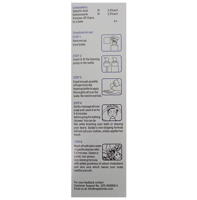 Saldan Shampoo is a combination of two medicines: Ketoconazole and Salicylic Acid which treat dandruff. Ketoconazole is an antifungal. It works by stopping the growth of dandruff-causing fungi by preventing them from forming their own protective covering. Salicylic Acid is a keratolytic medicine which helps break down the skin clumps on scalp and relieves itching and flaking associated with dandruff.